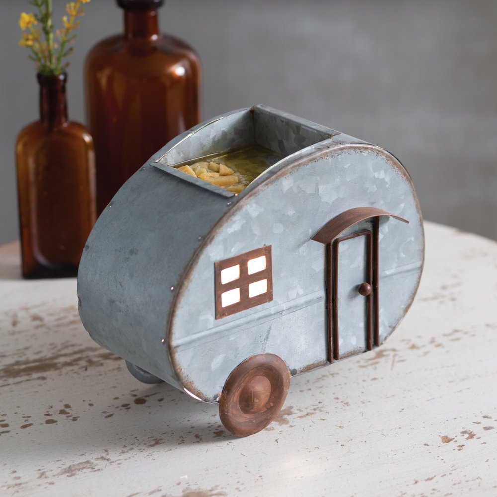 Hitch up and take the road less traveled with this rustic camper. Drop your favorite scent and experience a delightful aroma and warm glow of the light that shines through. Comes with a 25 watt bulb. Wax potpourri is not included. Electrical items have a small on/off switch on the cord.